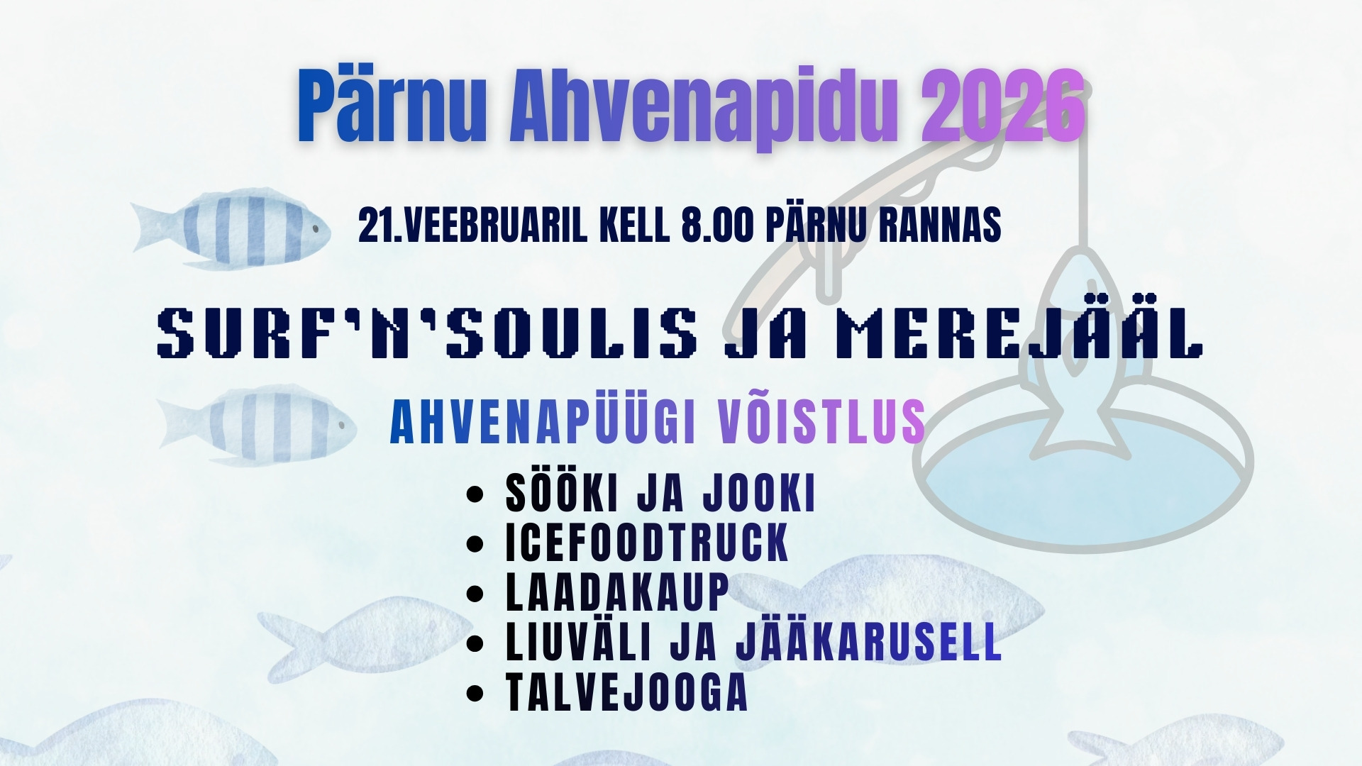 Pärnu ahvenapidu on meie talvine sündmus, et tähistada seda aegade taha ulatuvat talvist kalapüügi traditsiooni, nautima loodust, väärtustama talve ja koosolemist. Sel aastal Pärnus, Surf`N`Soulis kohapeal rannas ja merel.